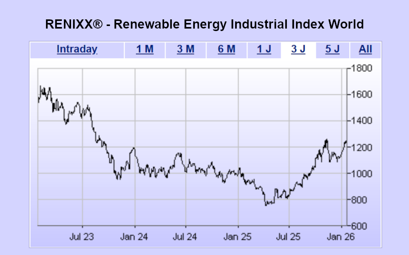 The RENIXX® World (Renewable Energy Industrial Index, ISIN: DE000RENX014) is the world’s first stock index for renewable energies and the oldest global stock market barometer for this industrial future sector. It covers wind energy, solar energy, bioenergy, geothermal energy, hydropower, electromobility, hydrogen and fuel cells.